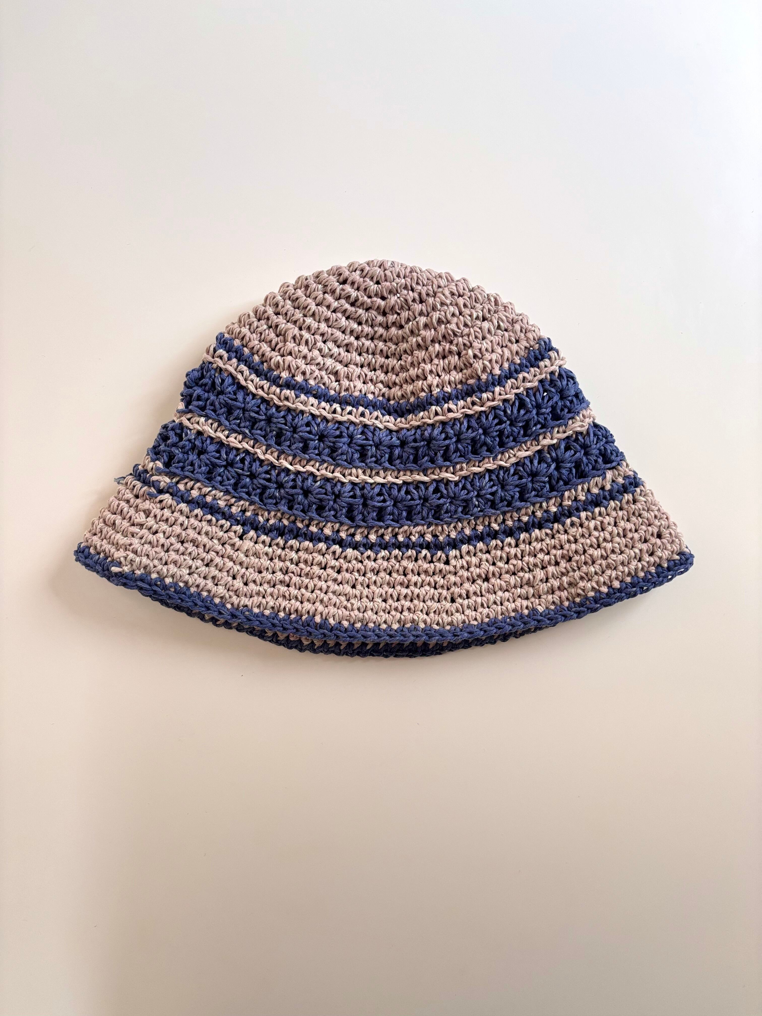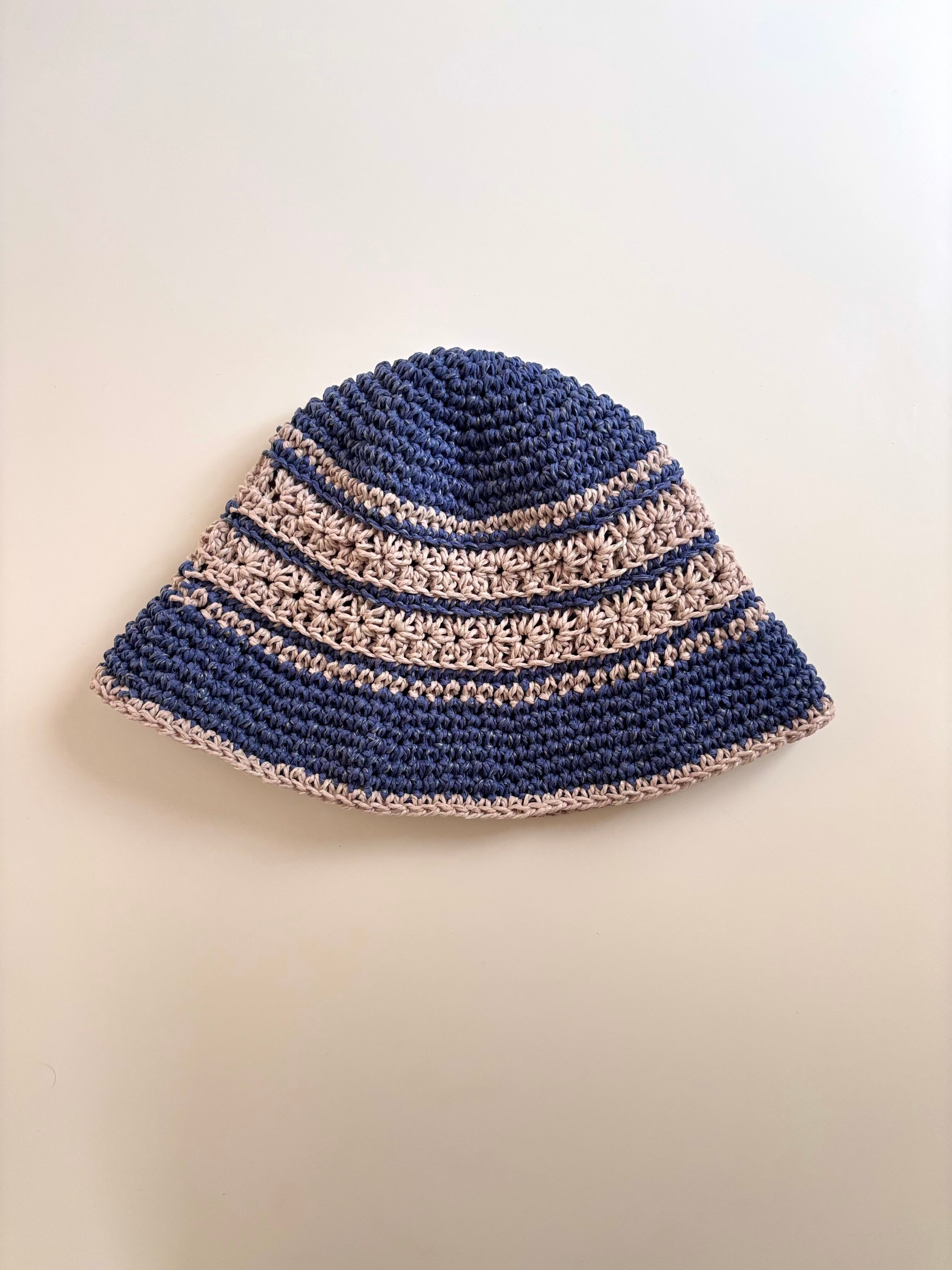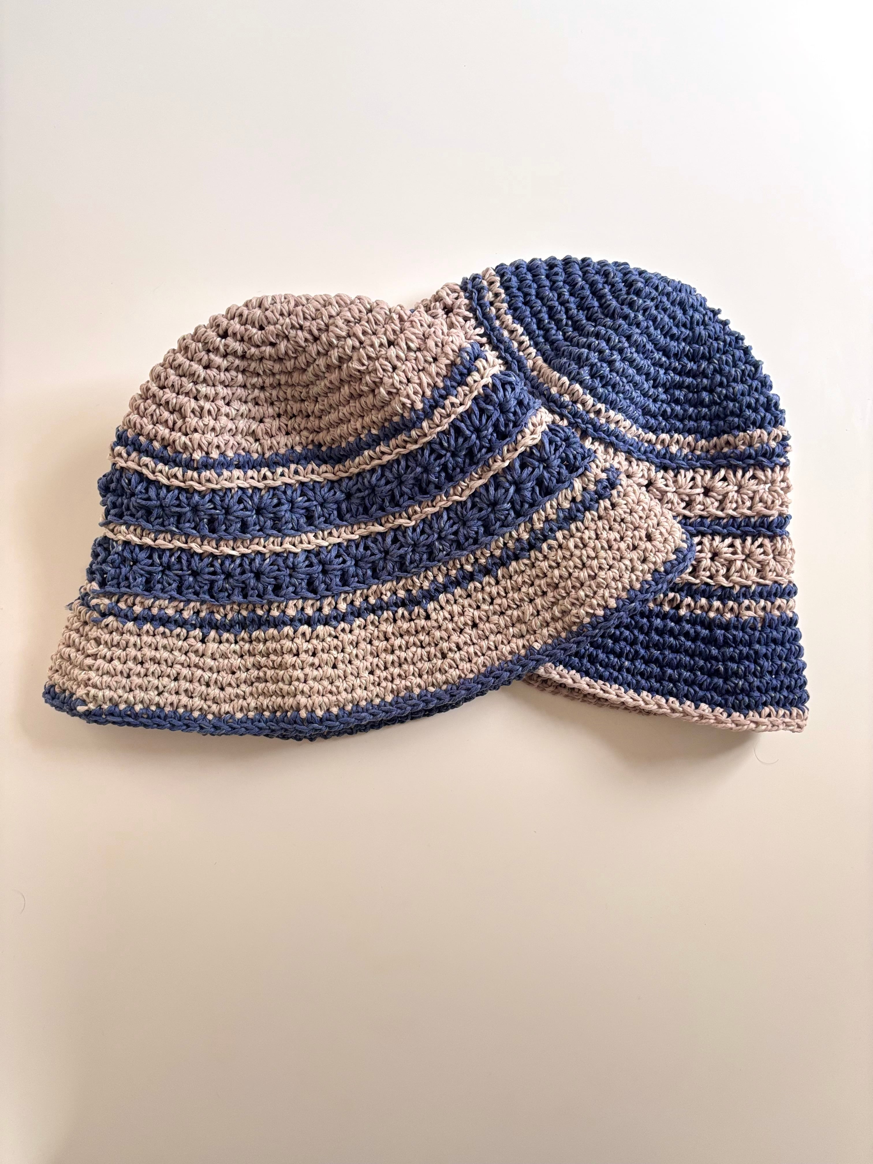 2色の糸で夏のビーチを表現し、編まれた手編みのハット。